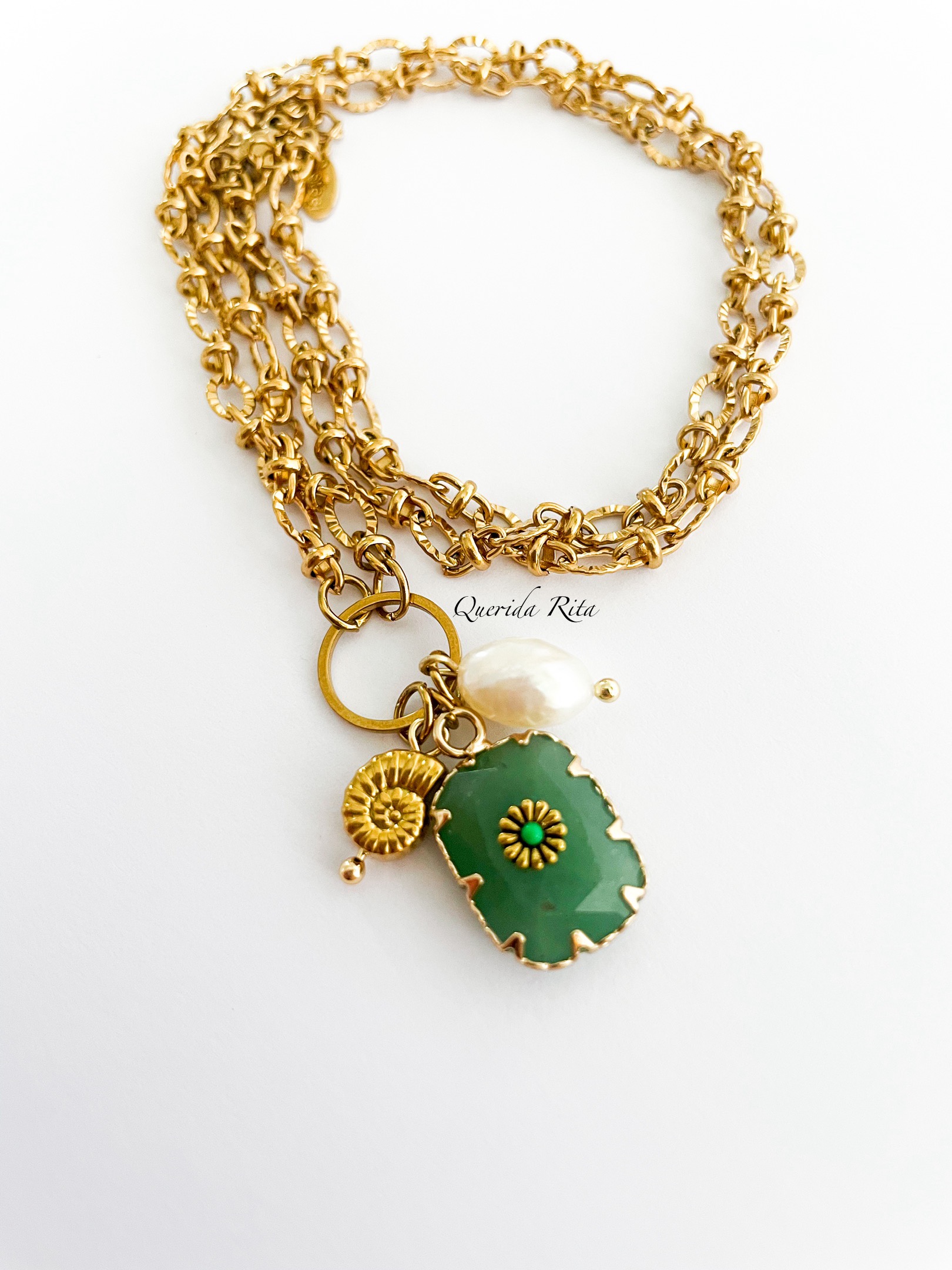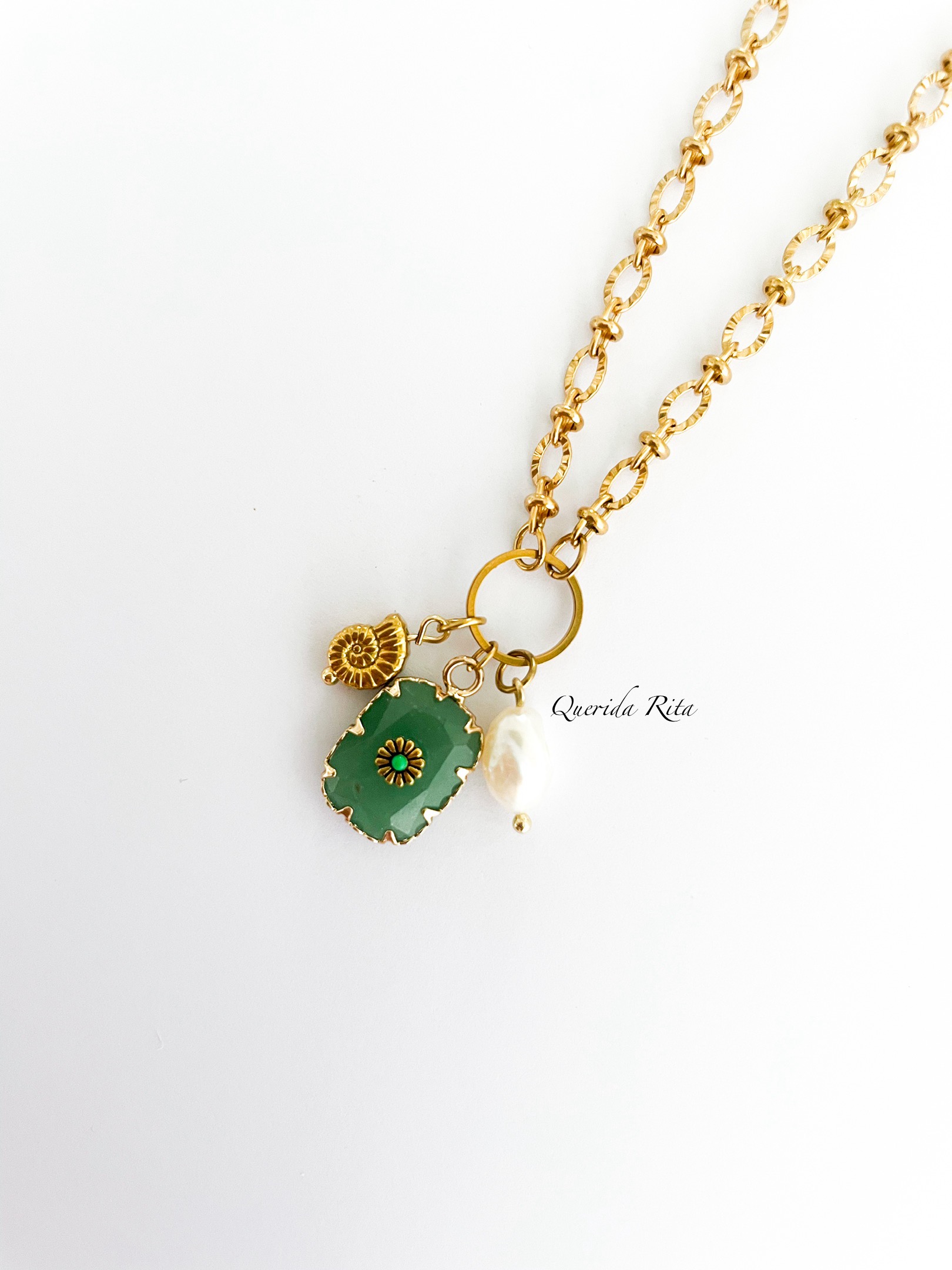 Un collar donde el dorado del acero se combina con la delicadeza de la perla de agua dulce y el detalle marino del caracol, creando una pieza sutil pero con mucha personalidad.
