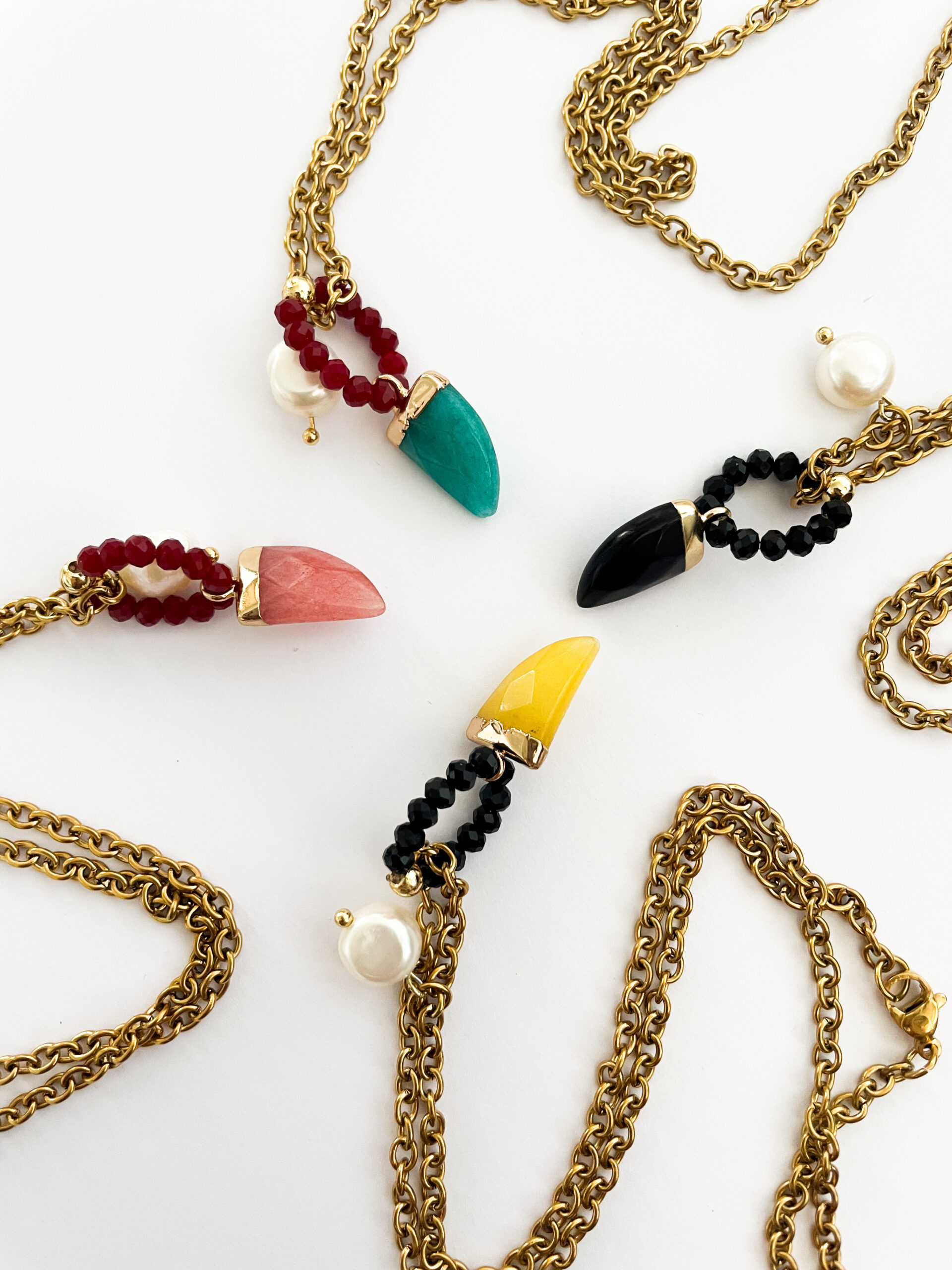 Collar de diseño elaborado con piedra natural tallada, combinado con una cadena de acero inoxidable de alta calidad y una delicada perla de agua dulce que aporta un toque sofisticado.
