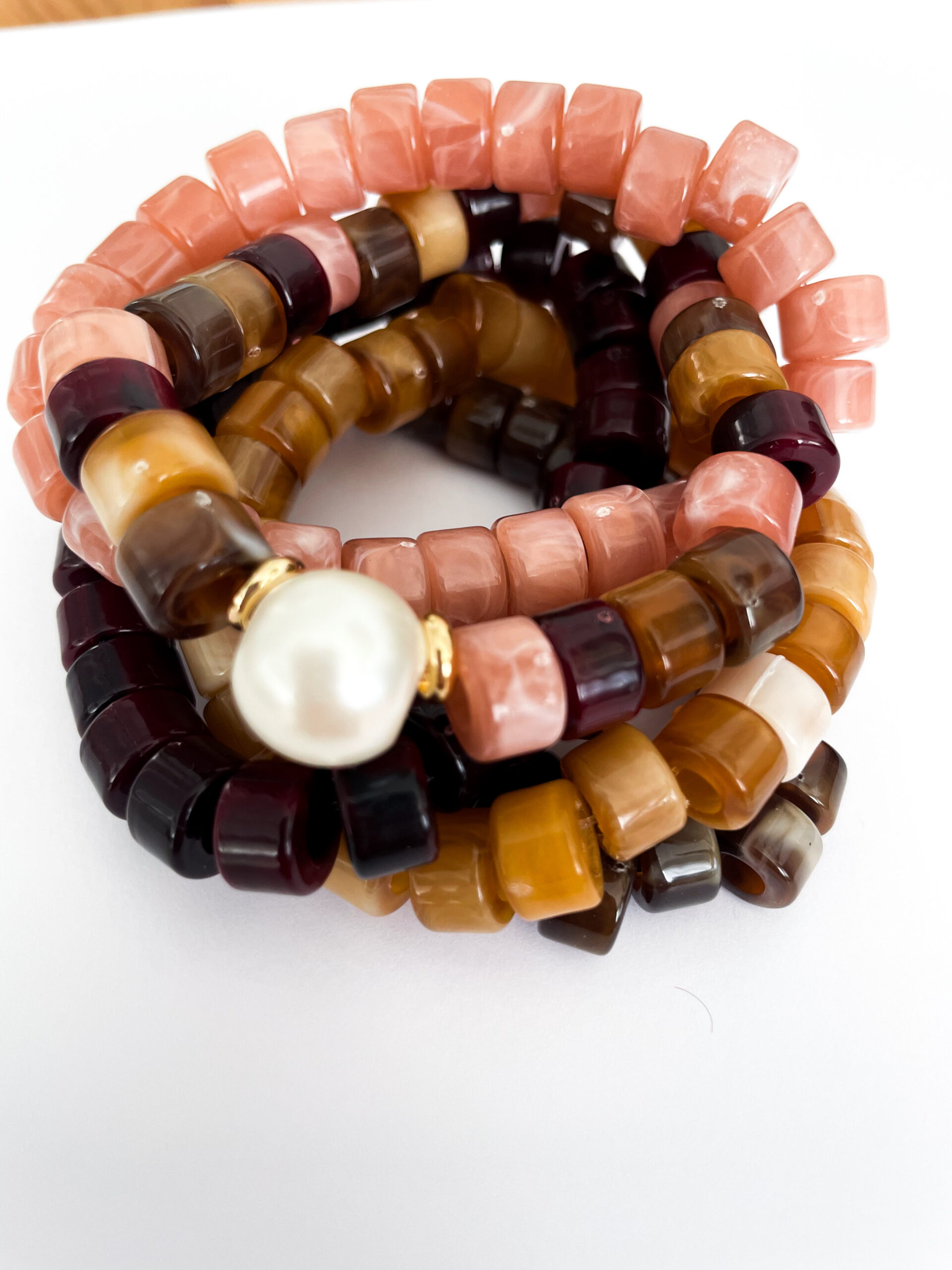 Diseñada con cuentas acrílicas en tonos tierra, rosados, caramelo y burdeos, y detalles en acero dorado, es el complemento ideal para añadir color y estilo a tus looks.