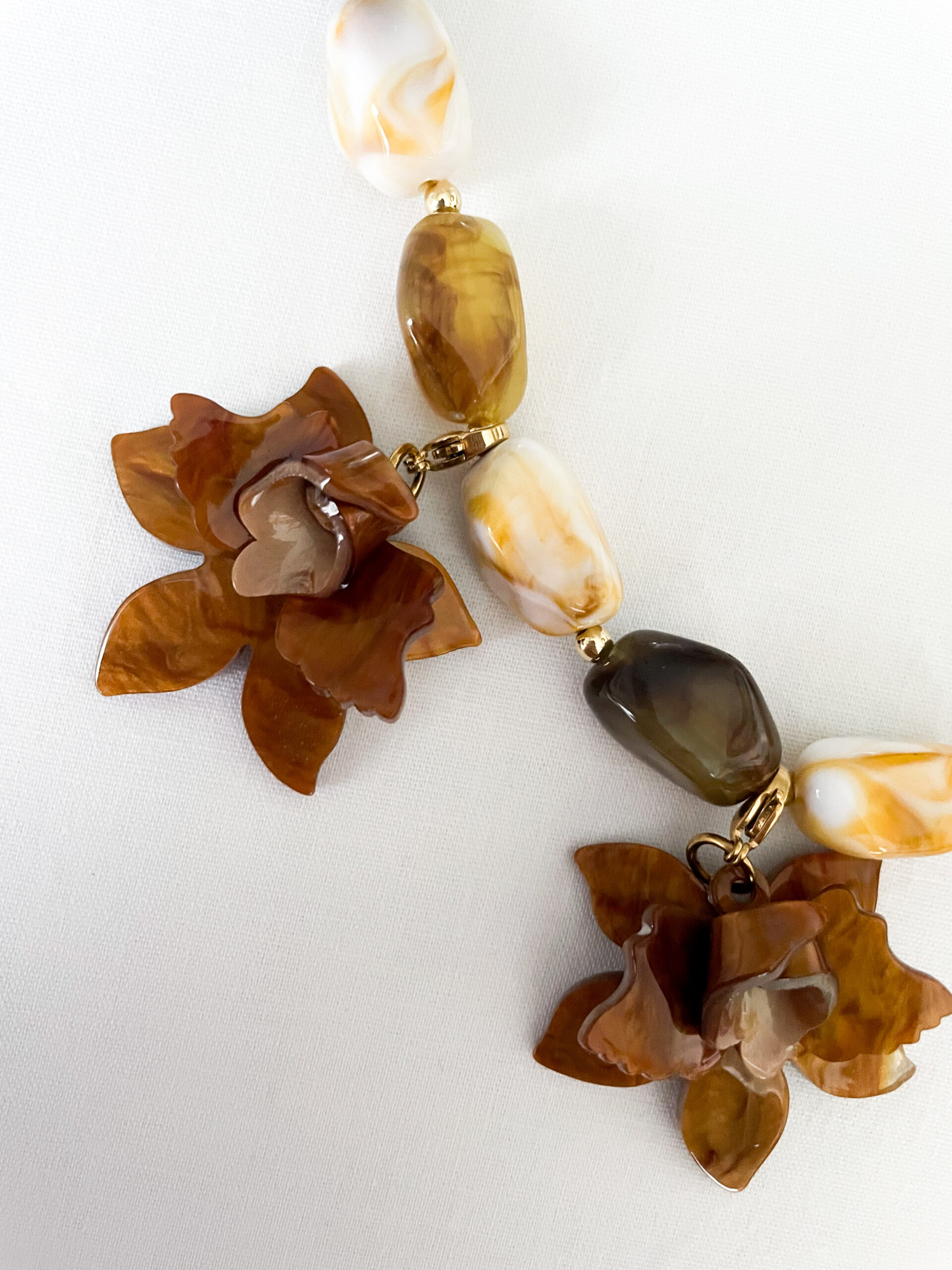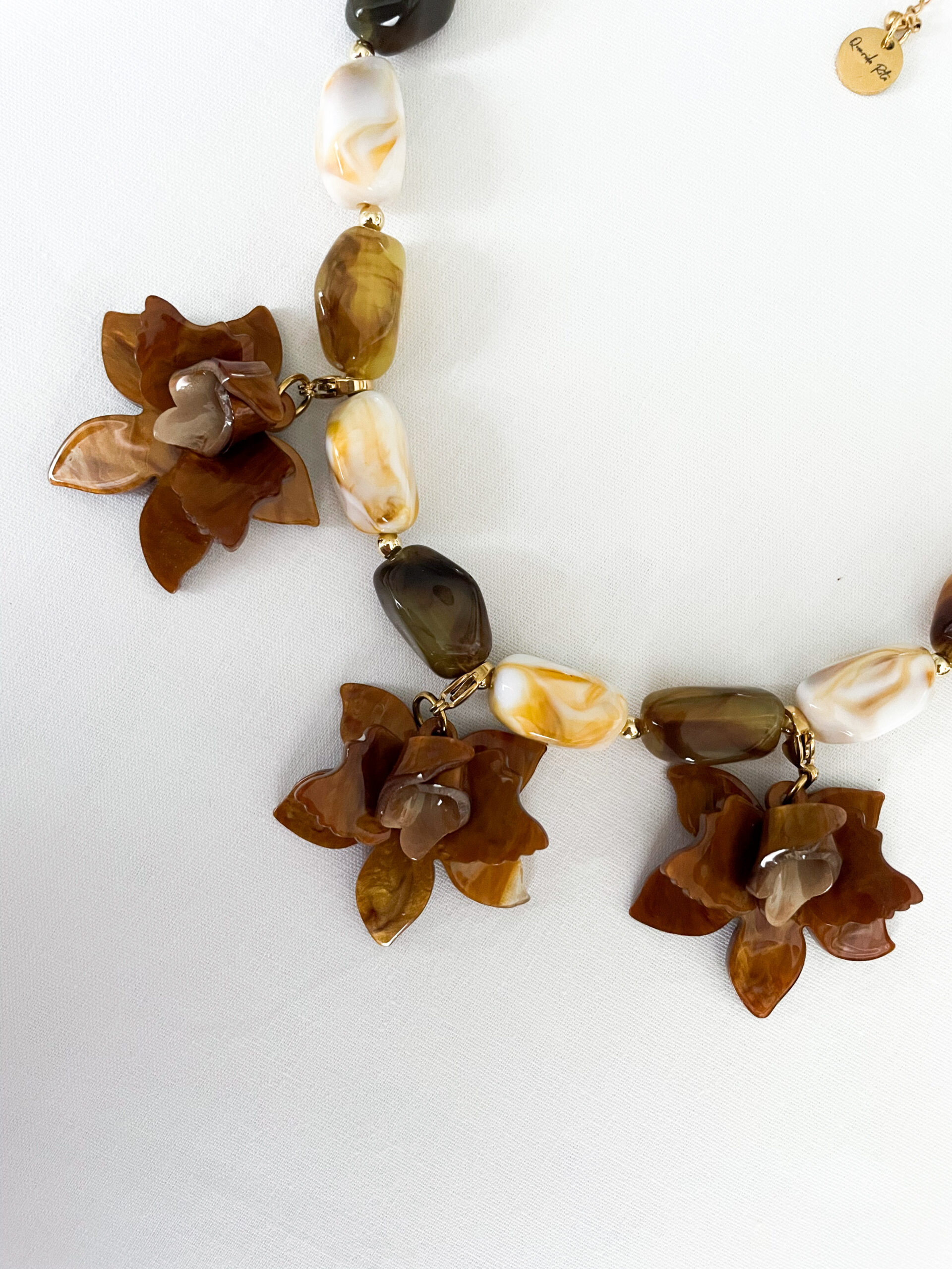 El collar destaca por sus tres flores acrílicas que pueden colocarse o retirarse fácilmente, permitiéndote adaptar la pieza a cada ocasión. Llévalo con las flores para un toque romántico y artístico, o sin ellas para un estilo más limpio y minimalista.