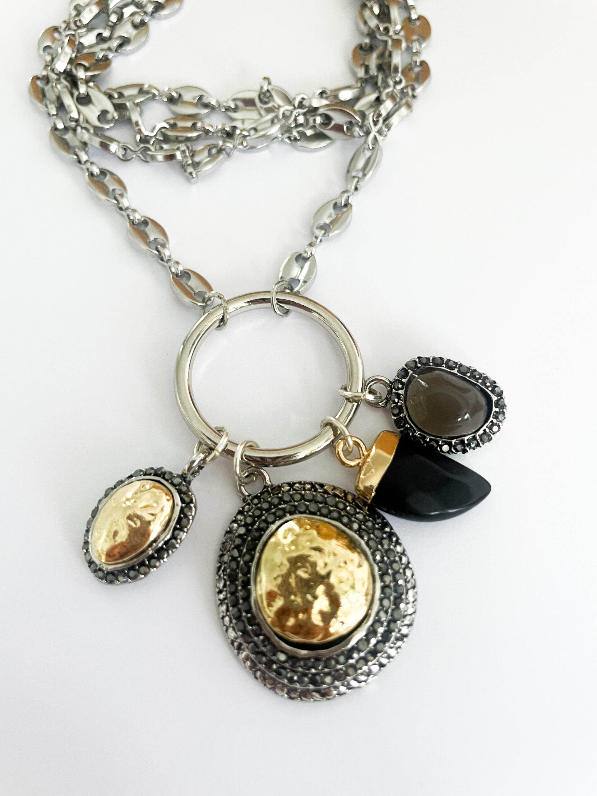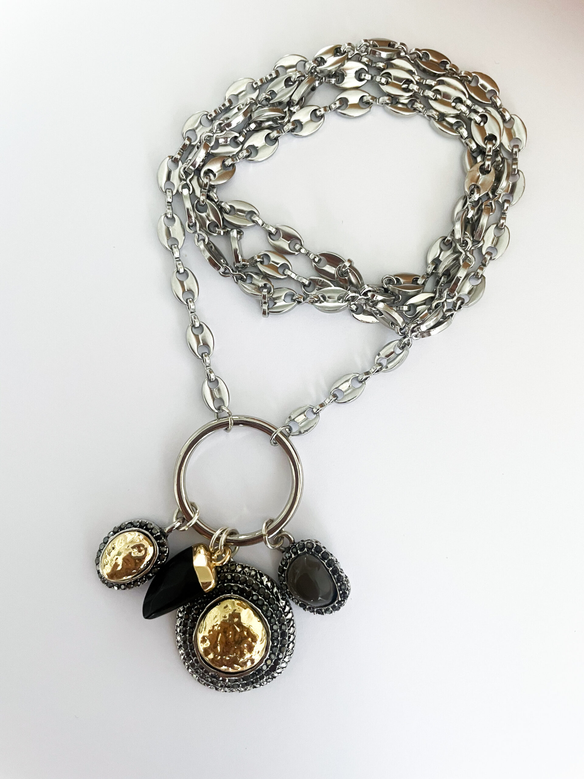 Su cadena de acero plateado de aproximadamente 75 cm aporta un aire moderno y sofisticado, mientras los charms metálicos añaden dinamismo y textura al conjunto.
