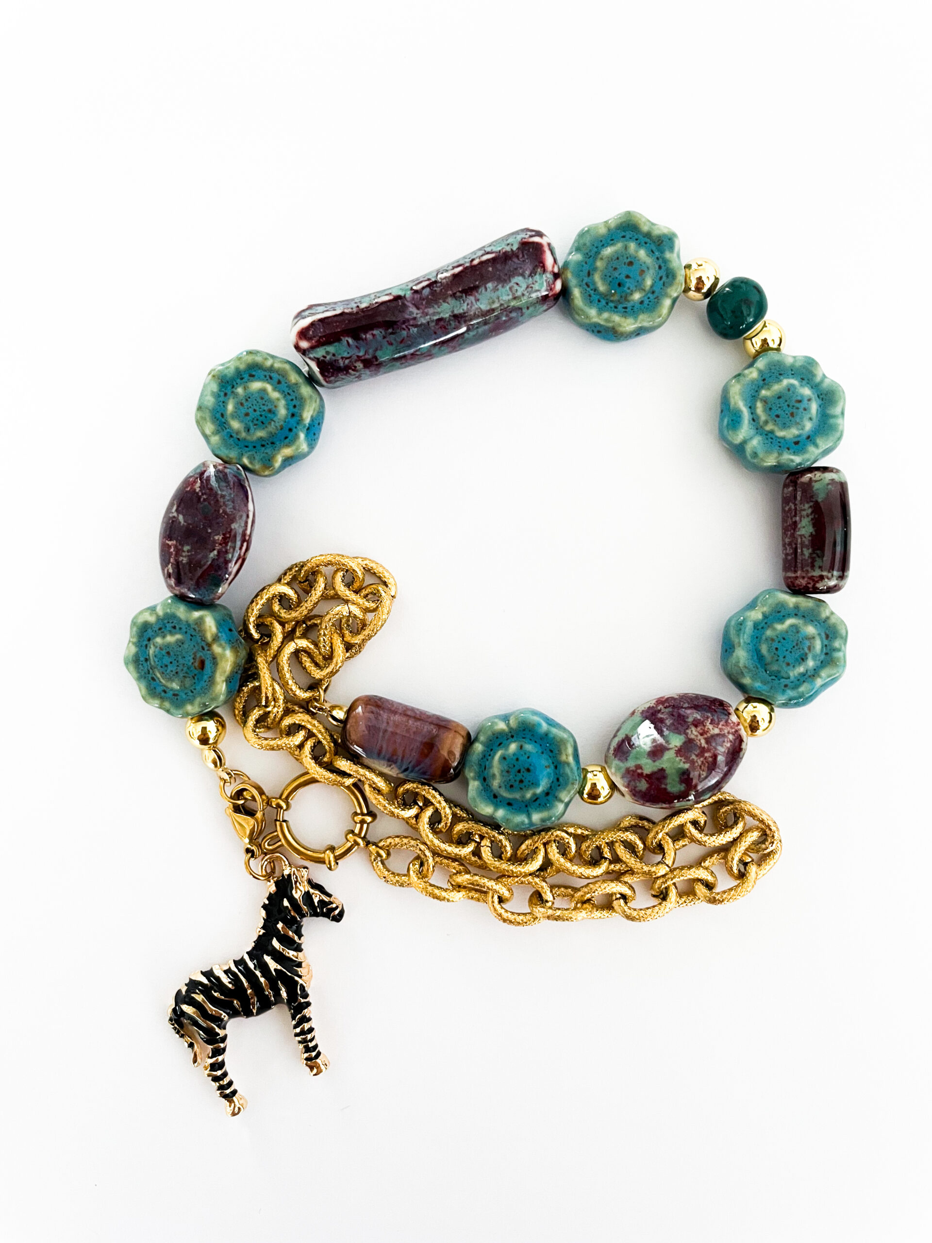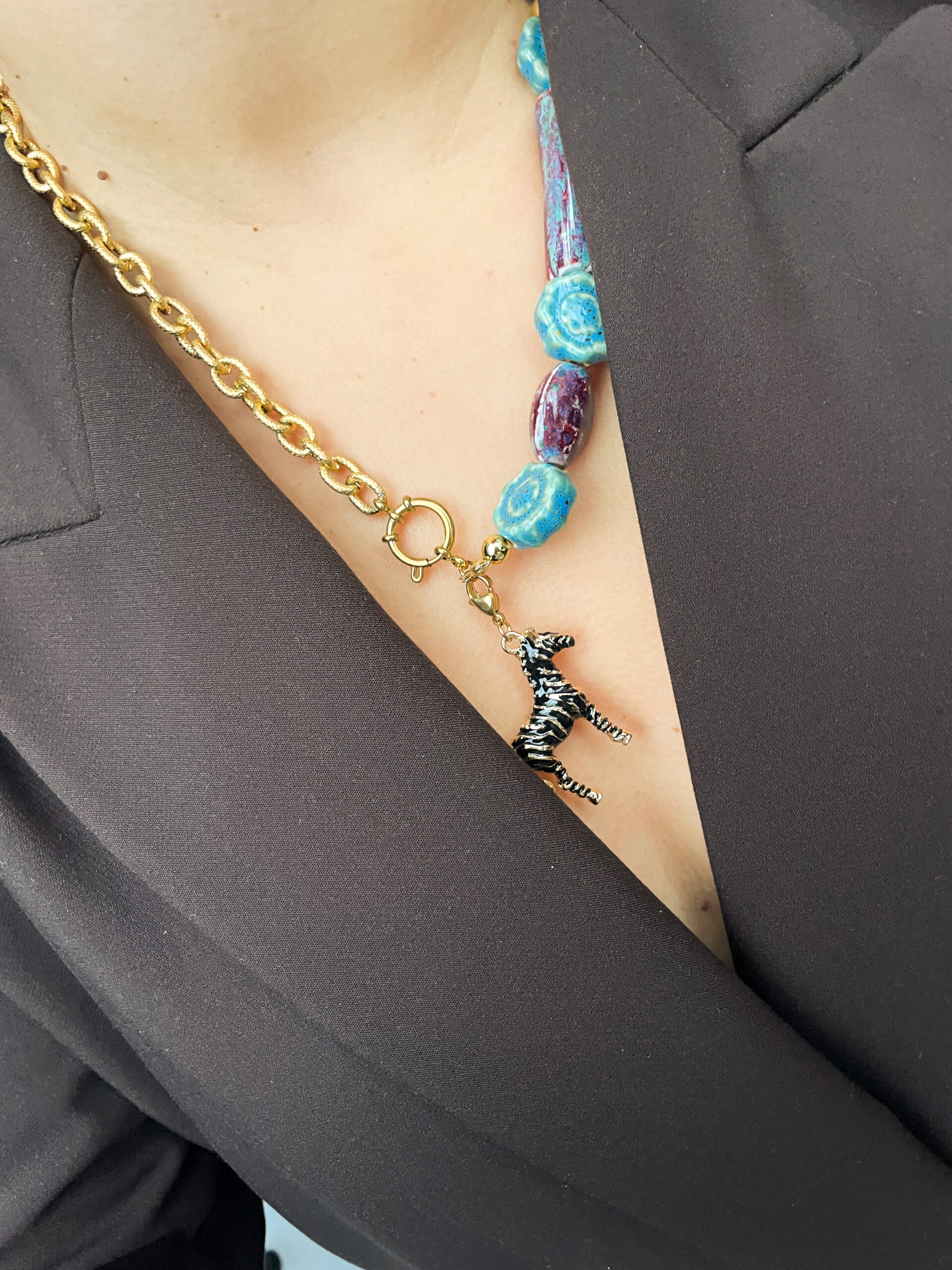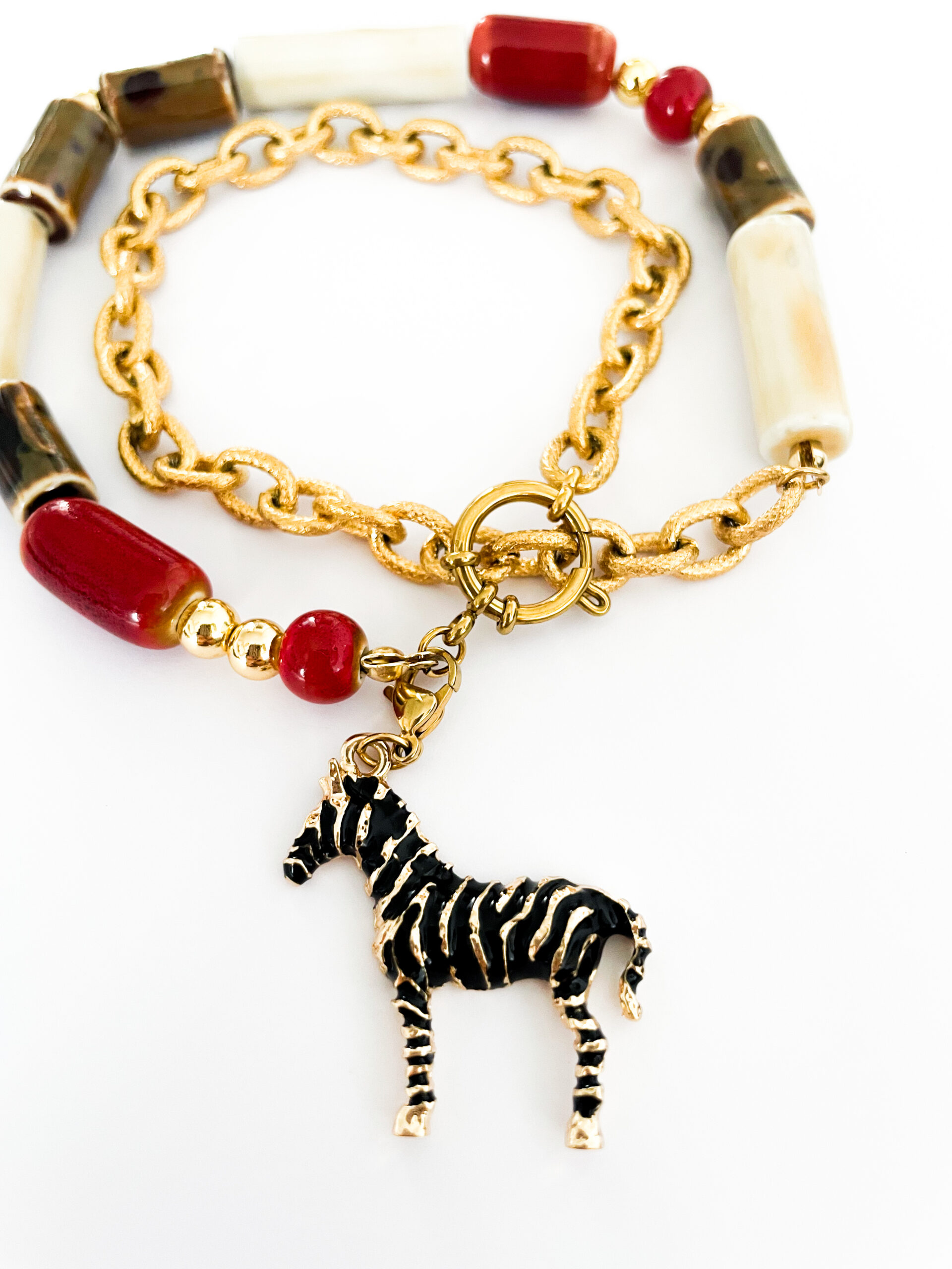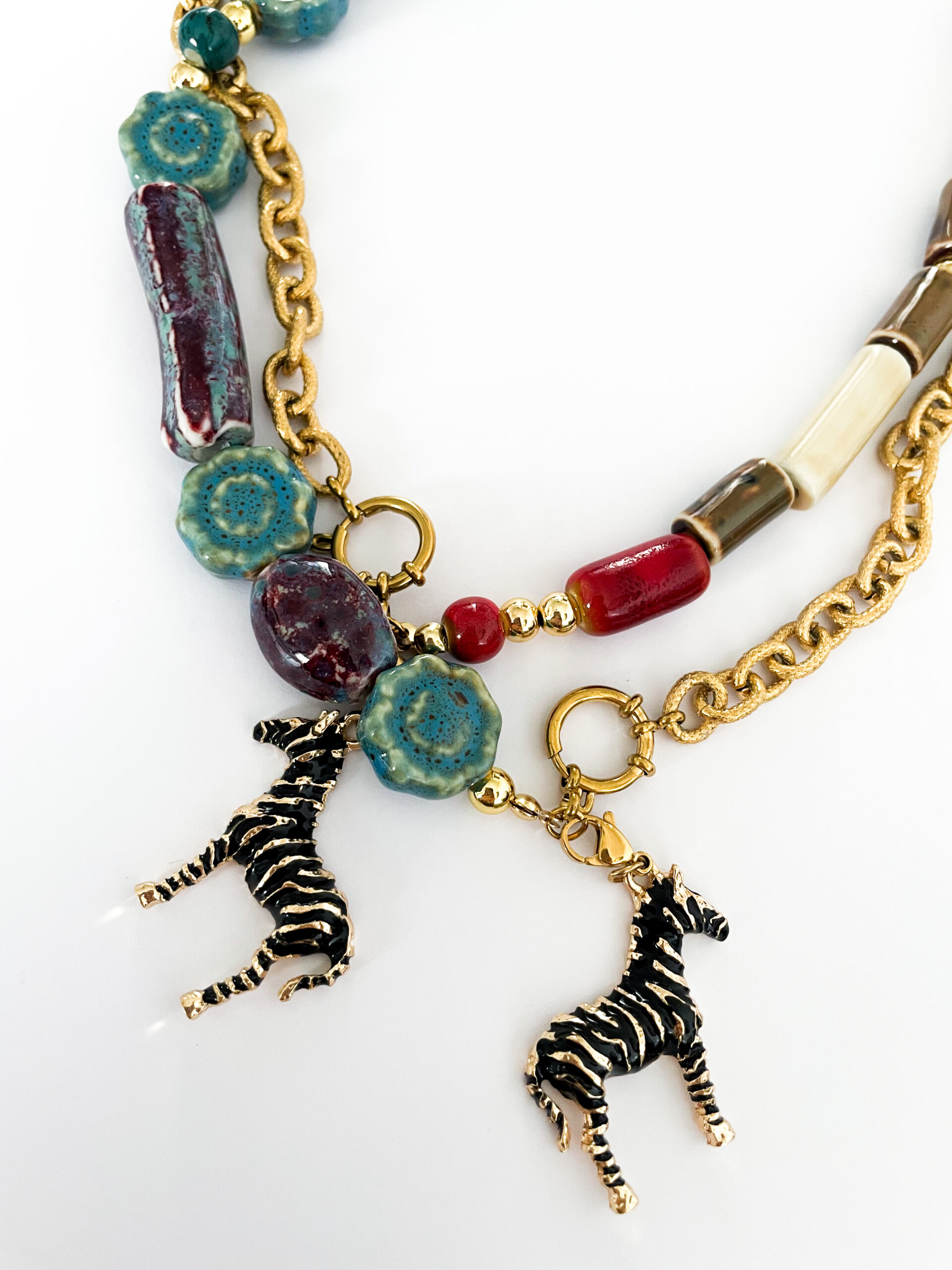 Una pieza llena de carácter y encanto artesanal. El collar La Cebra Ginebra combina cuentas de cerámica trabajada a mano con una cadena de acero dorado, creando un diseño vibrante, único y exclusivo.