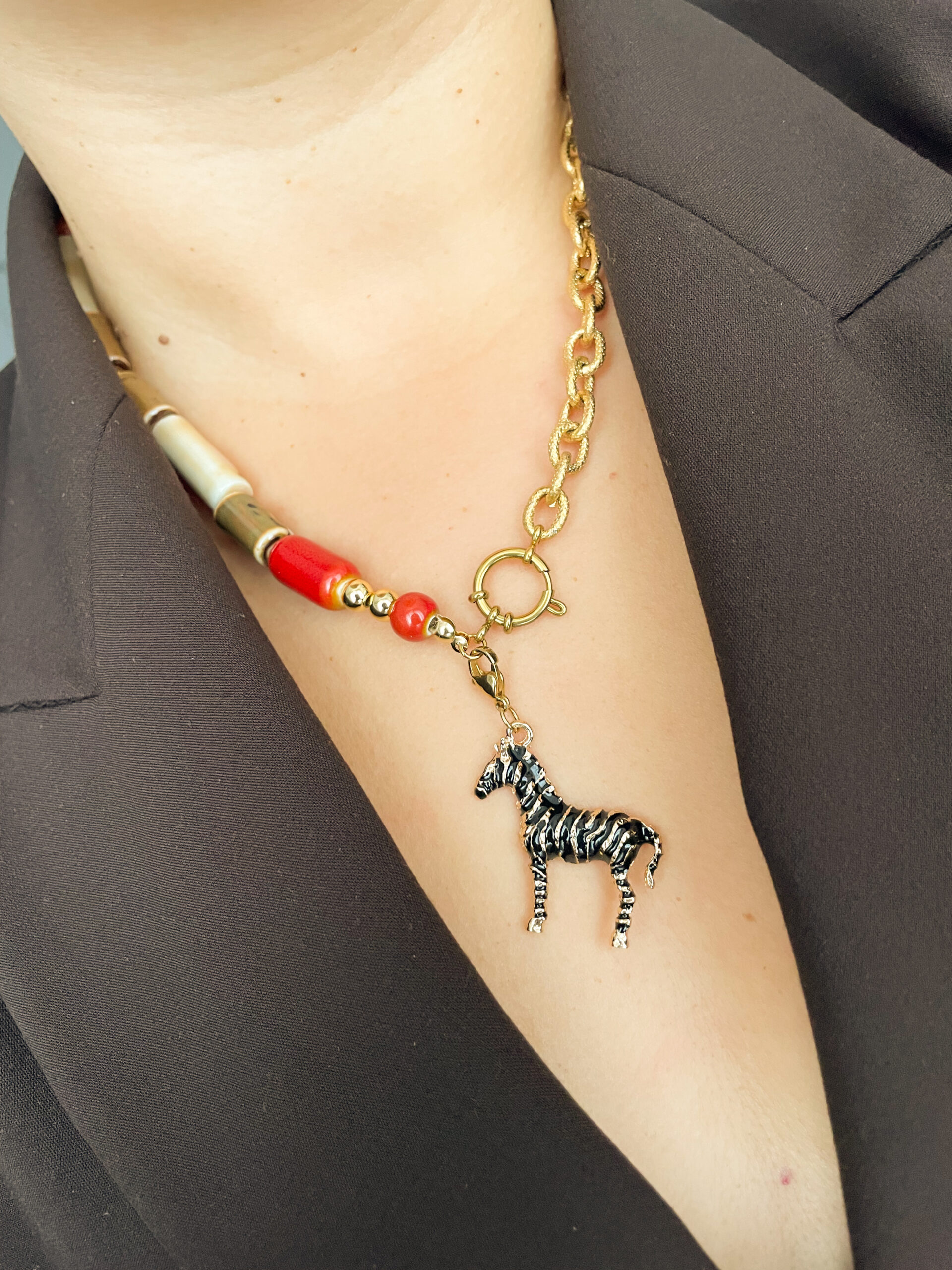 Los colgantes de cebra esmaltada aportan movimiento y personalidad, convirtiéndolo en un accesorio que no pasa desapercibido. La cebra se puede quitar y poner gracias a su mosquetón.
