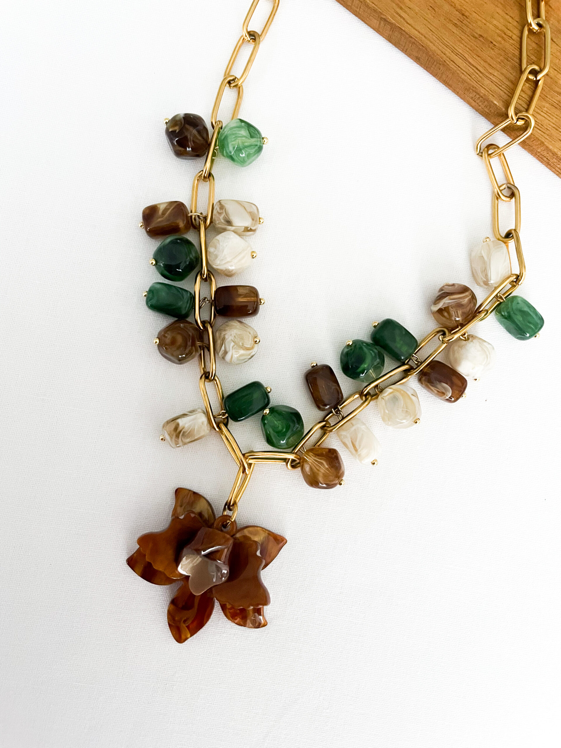 El collar combina la fuerza del acero inoxidable con la suavidad de las cuentas acrílicas en tonos tierra, verde y marfil. Su diseño estructurado y artesanal convierte cada pieza en un pequeño tesoro lleno de textura y color. Ideal para elevar un look neutro o acompañar prendas naturales como lino o seda.