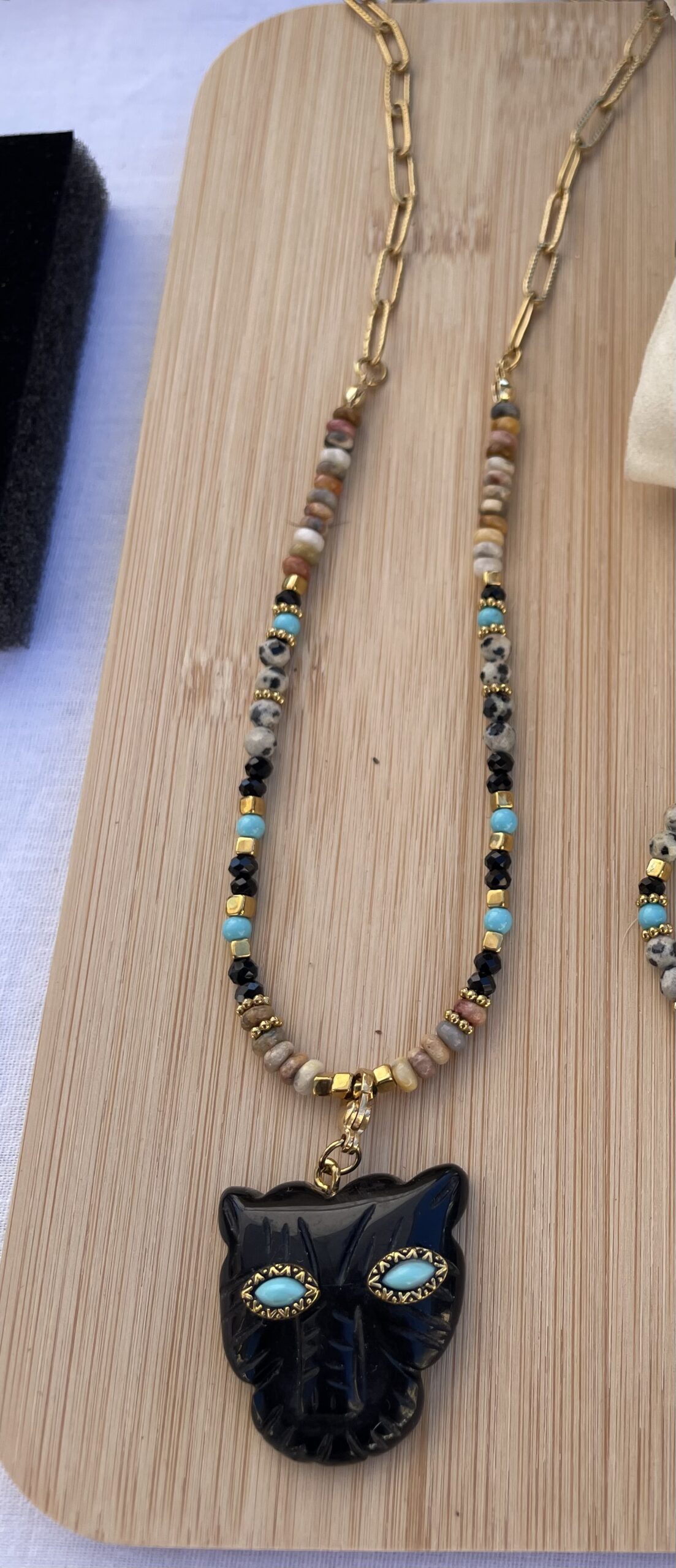Collar artesanal con colgante de cabeza de puma tallada en obsidiana negra, una piedra natural asociada a la protección y la fuerza interior.