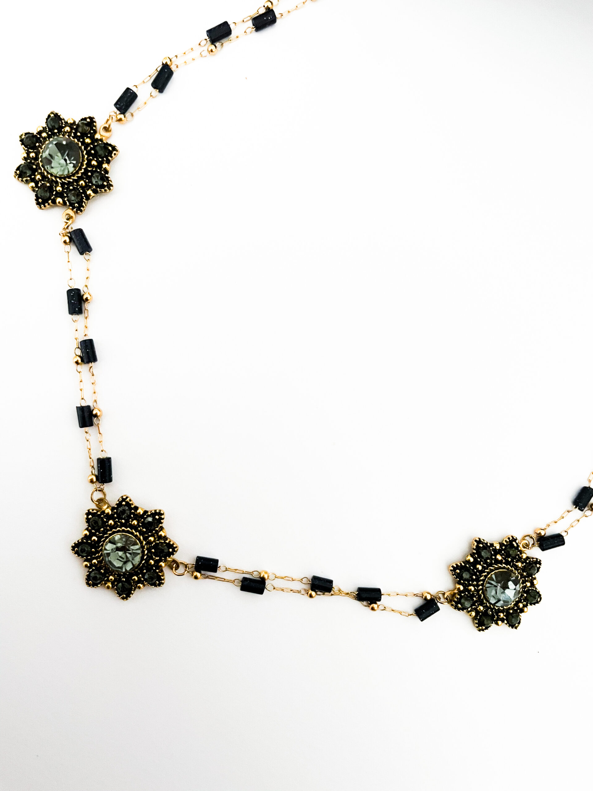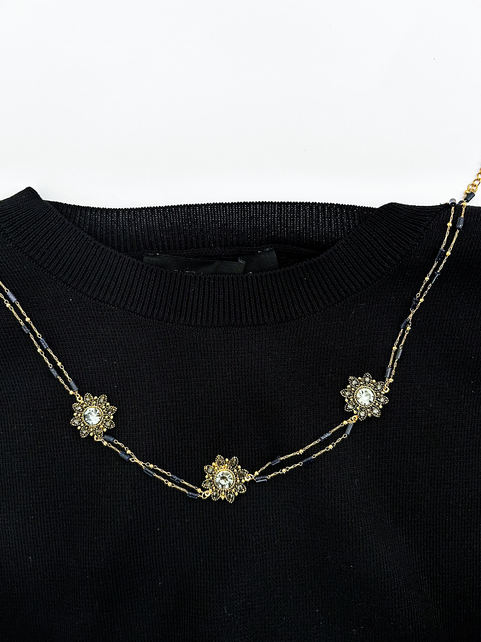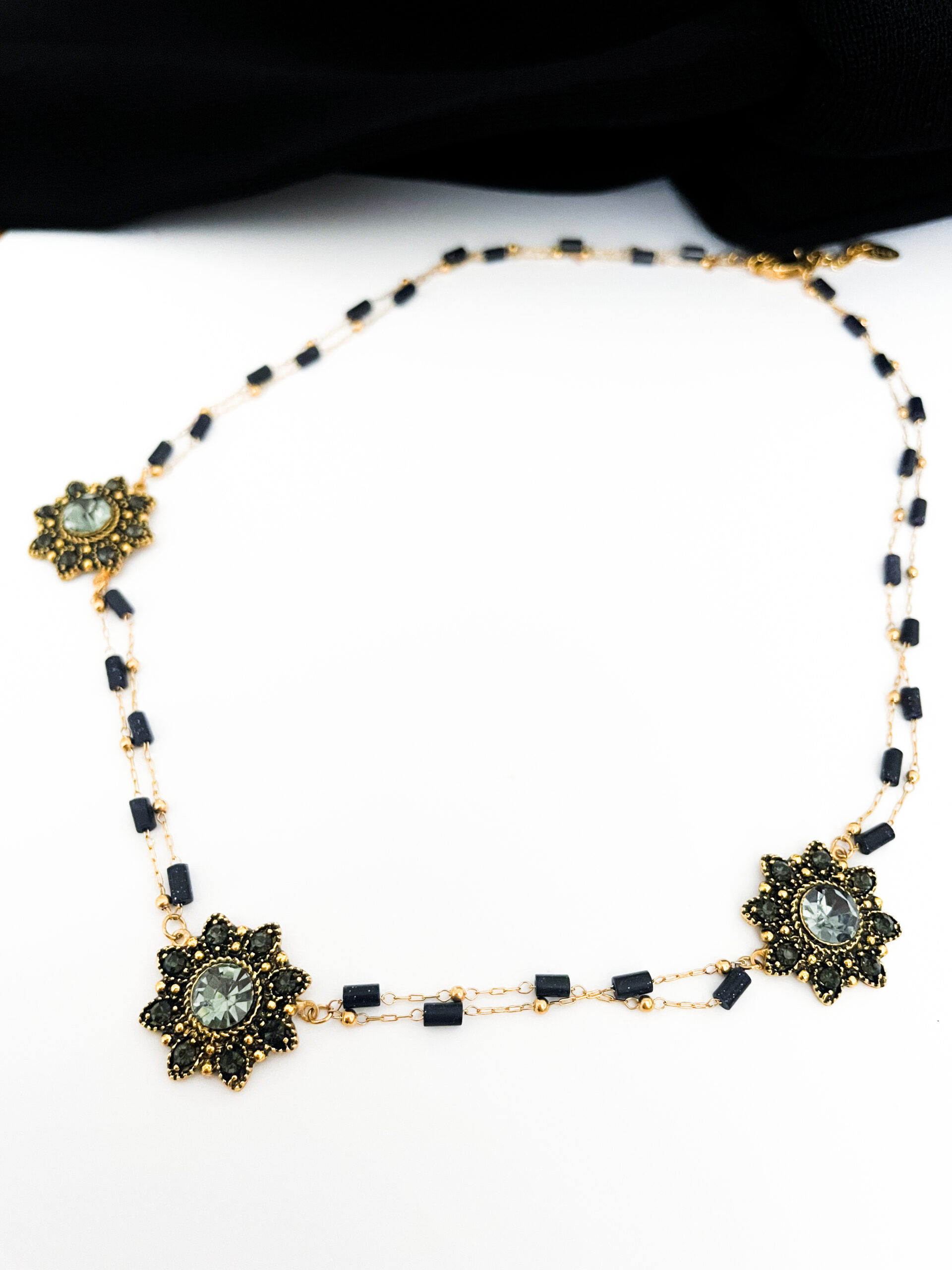 El collar Regina combina elegancia clásica y un toque sofisticado gracias a su diseño en acero dorado con circonitas negras engastadas en motivos florales. Su cadena doble de acero se alterna con pequeñas piedras tubulares negras que aportan textura y un acabado artesanal y distintivo.
