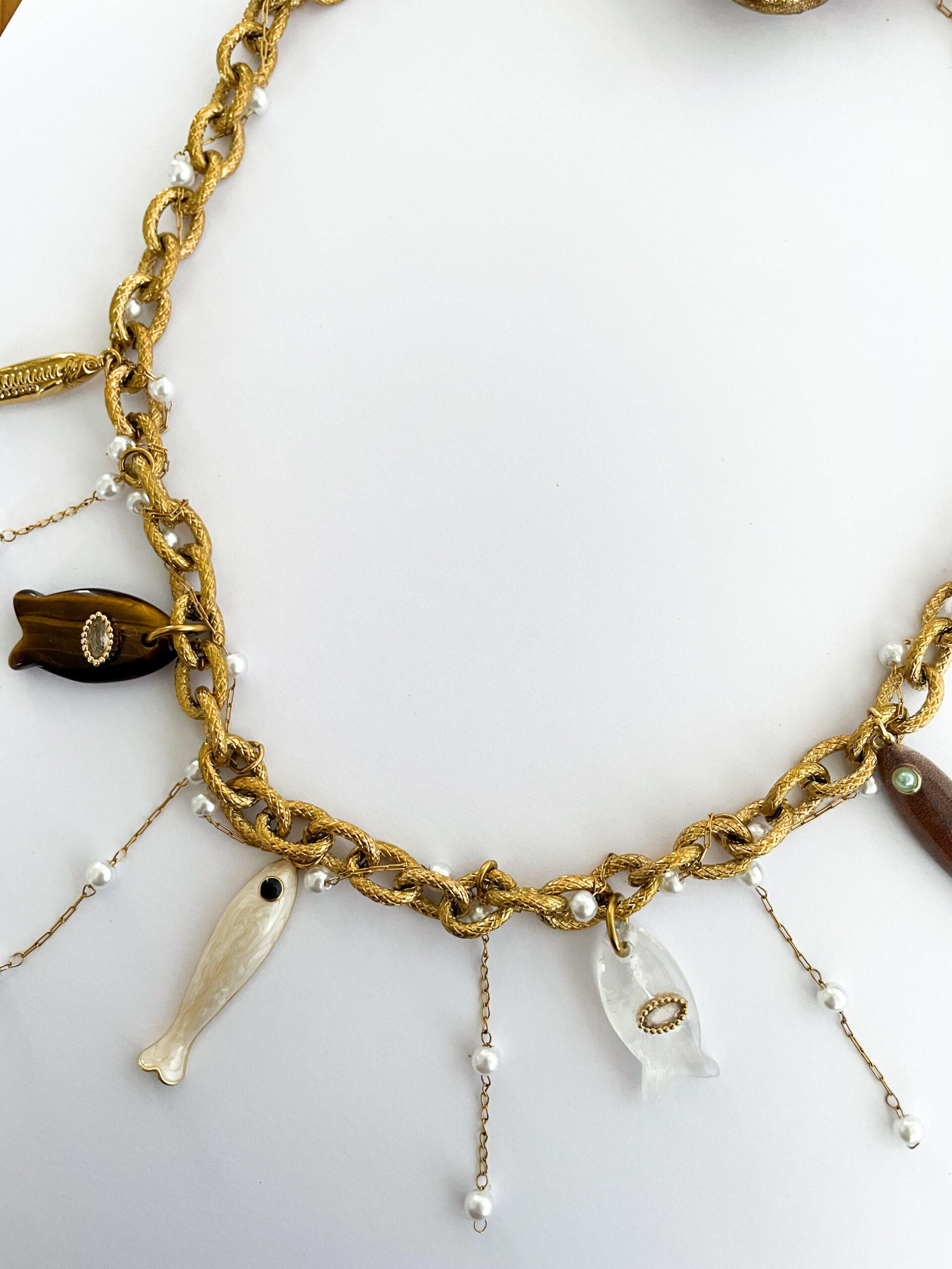 Sus peces —en piedra y en acero con baño de color— aportan movimiento, carácter y ese aire marino que convierte la pieza en algo especial.