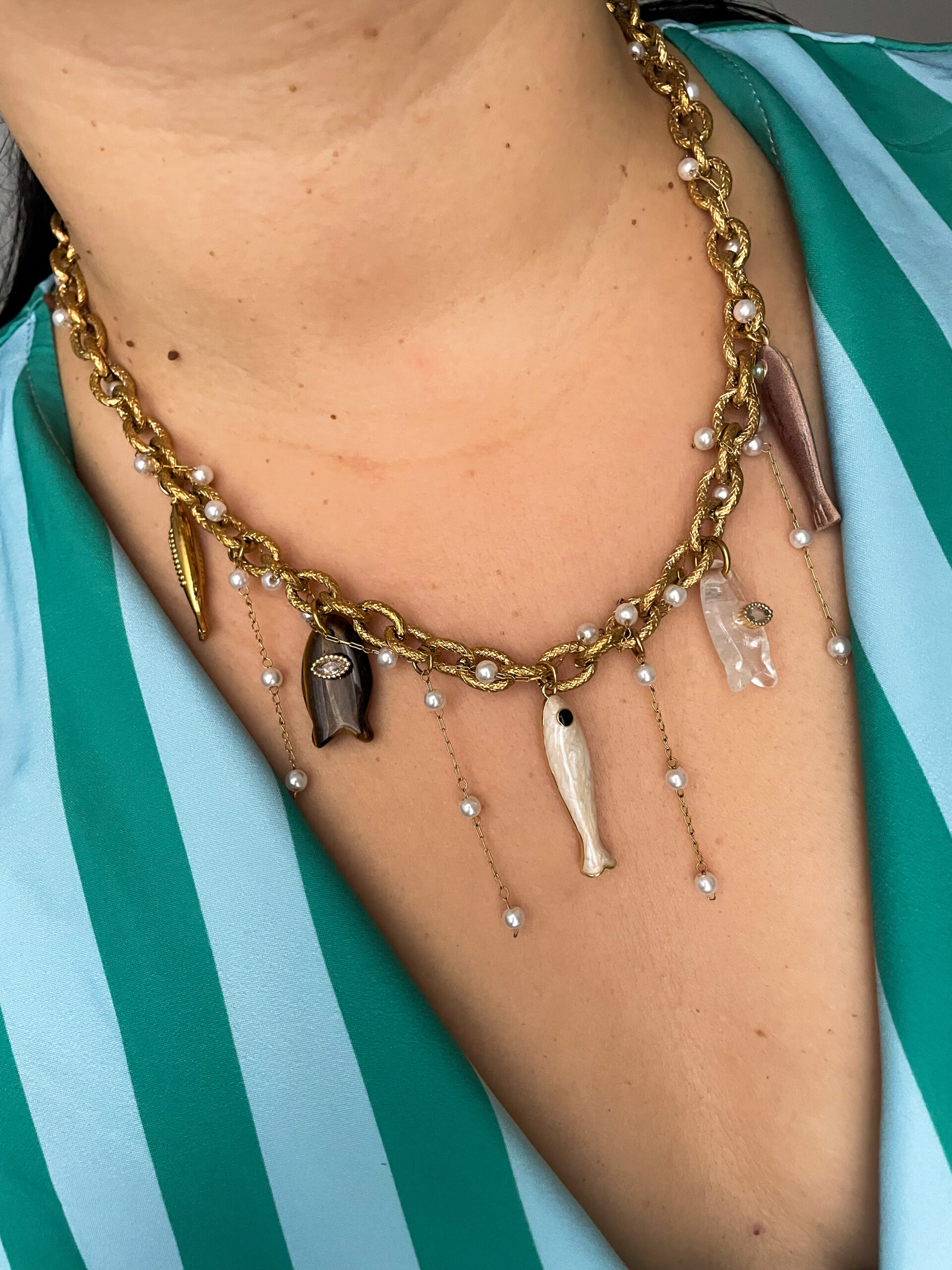 Una cadena de acero inoxidable con acabado dorado que se entrelaza con delicadas mini perlitas, creando un juego de luz sutil y elegante.