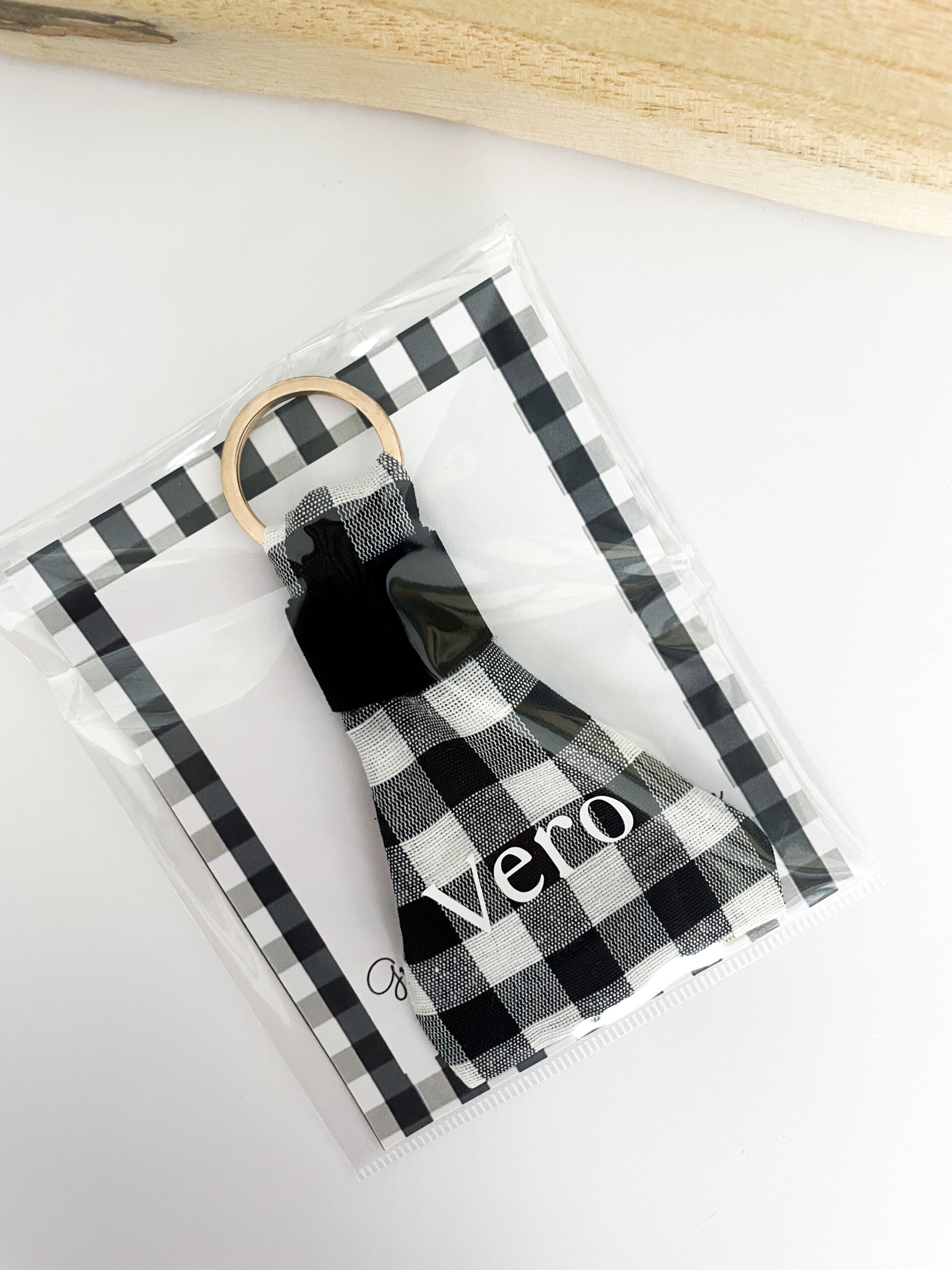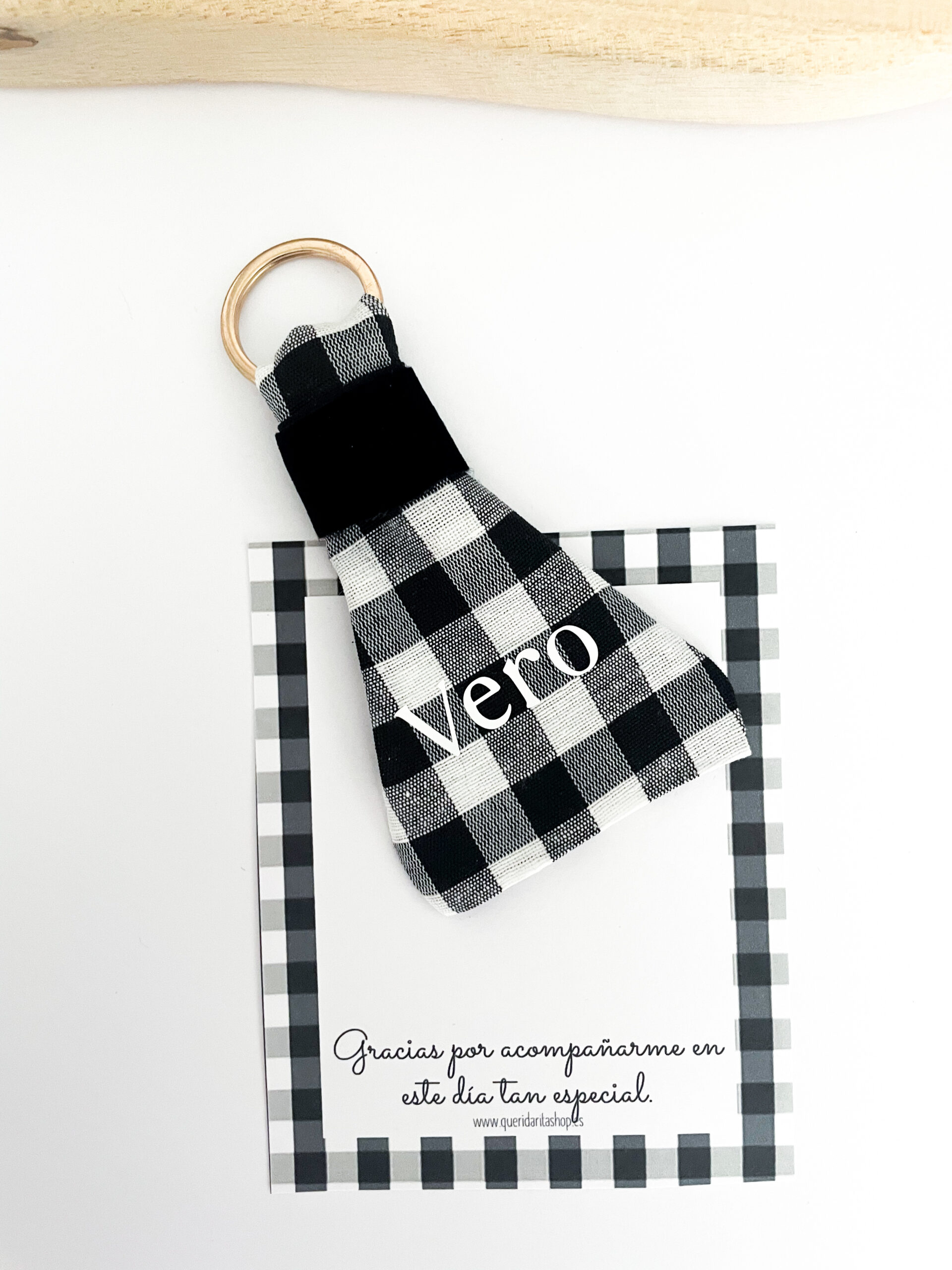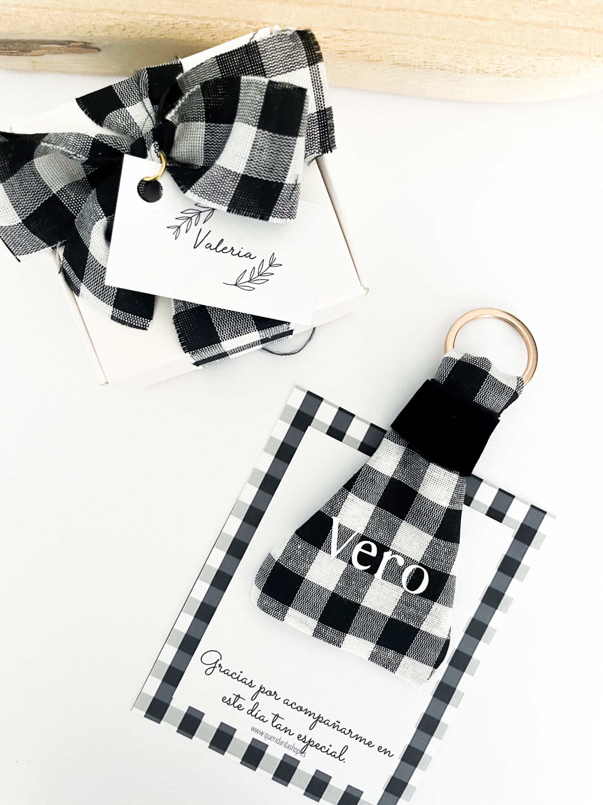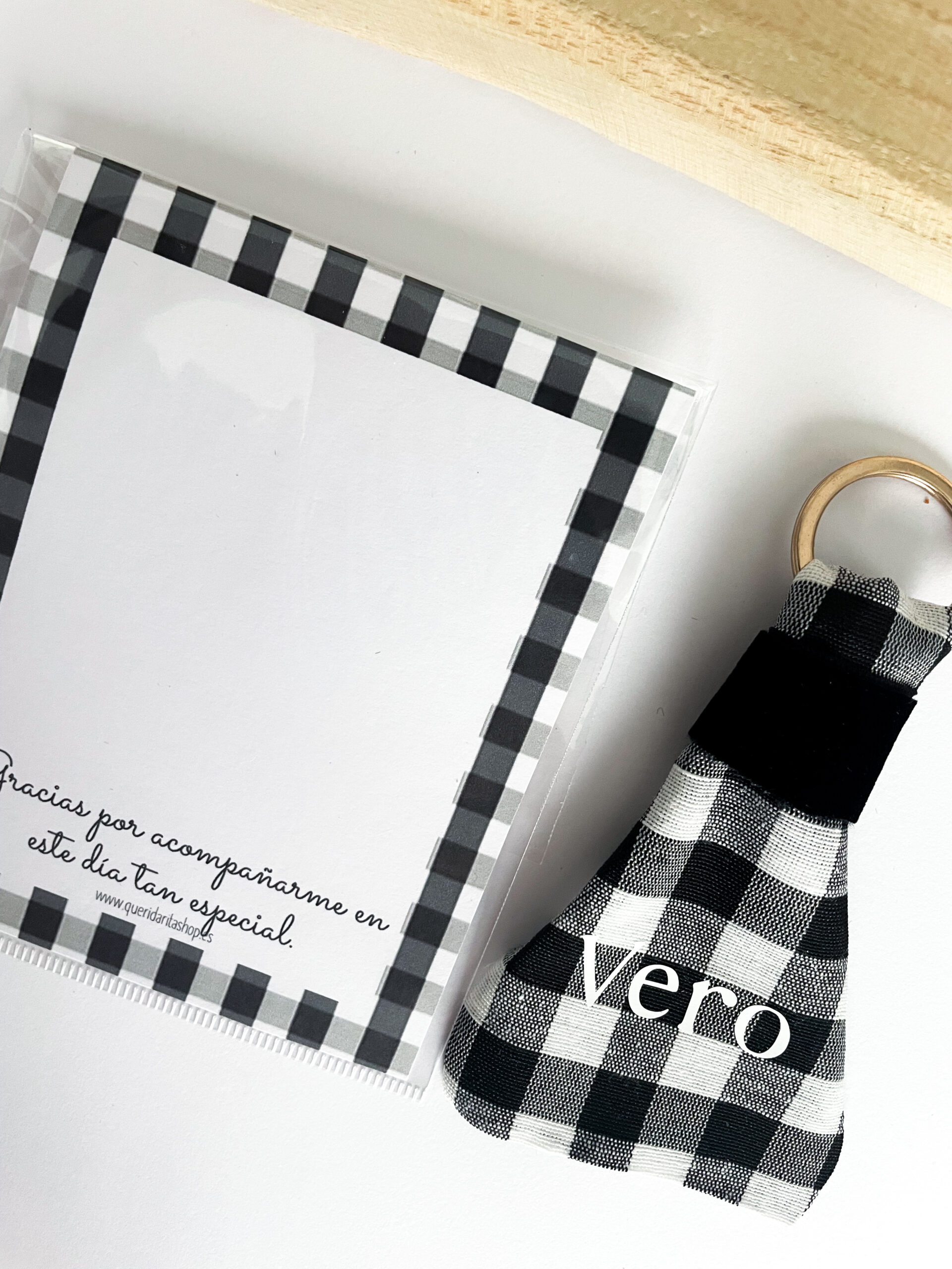 Pues el llavero vichy es ideal; hecho a mano, con nombre personalizado y tarjeta de agradecimiento también personalizadle.