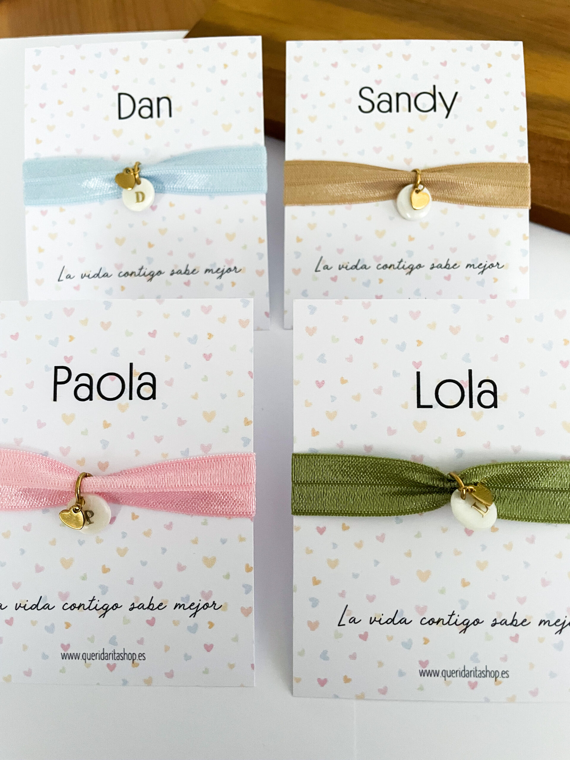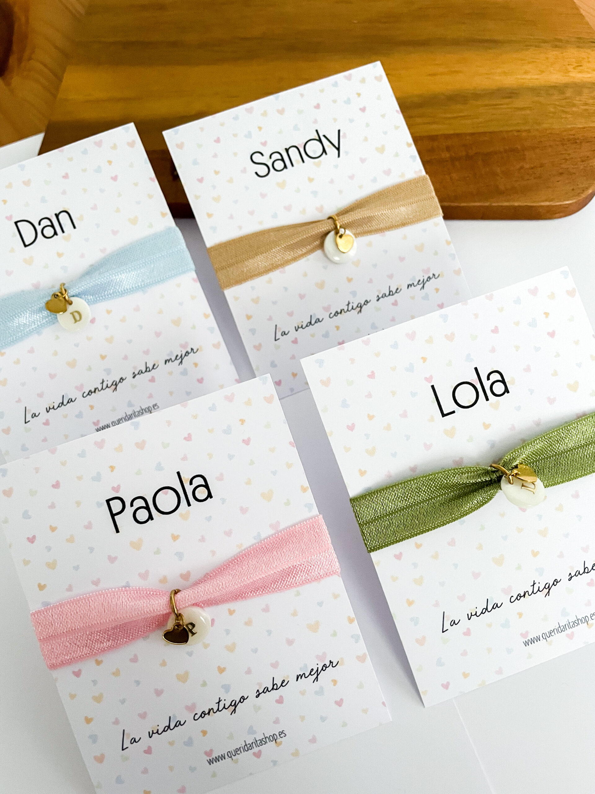 Un detalle delicado que tus invitados no olvidarán. Nuestra pulsera elástica personalizada combina una inicial de nácar con un pequeño corazón de acero inoxidable, creando un recuerdo elegante y muy especial para cualquier celebración. Personaliza la tarjeta con el nombre y mensaje que quieras y convierte este detalle en algo único.