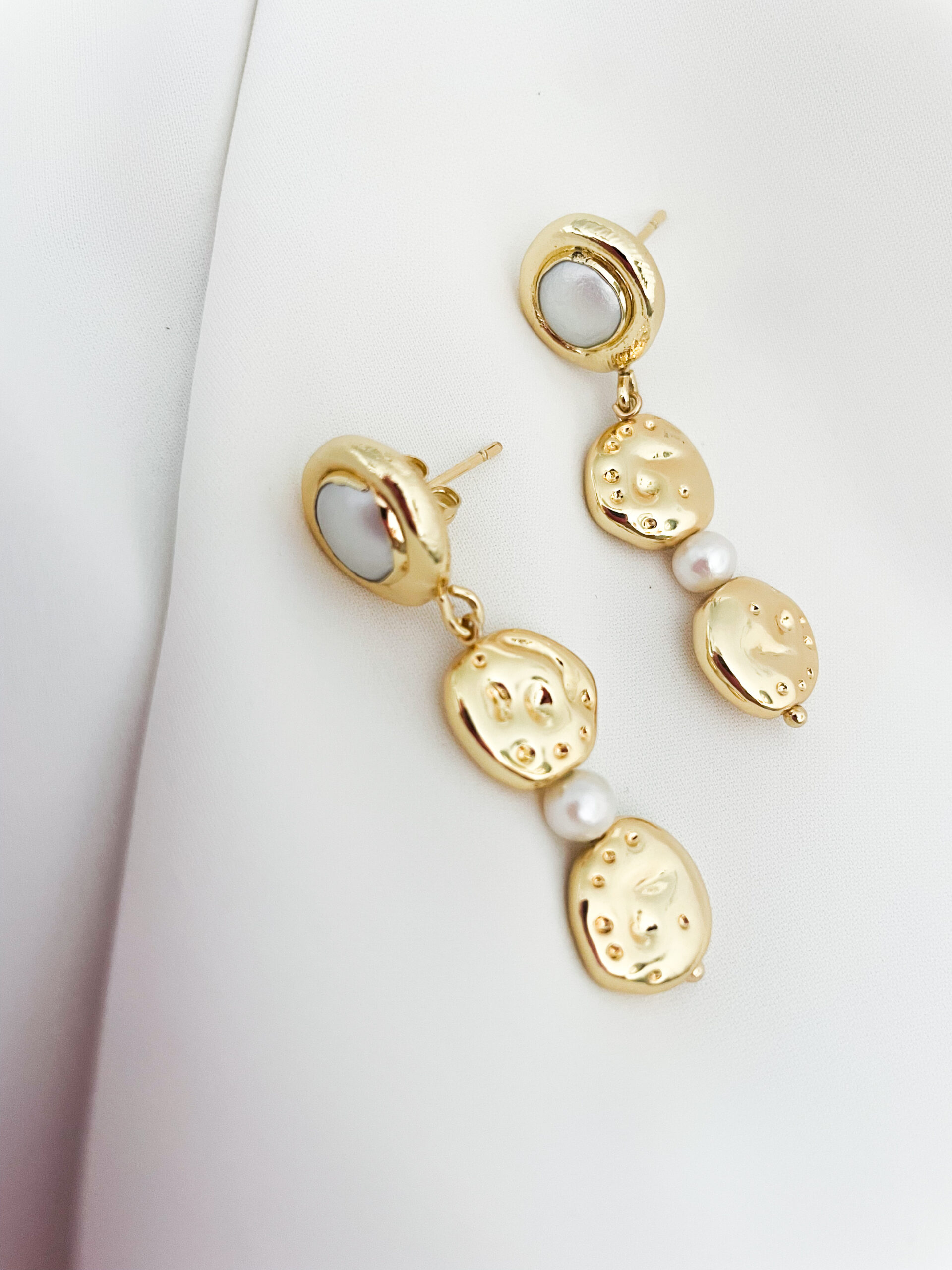 Es un pendientes elaborado a mano, con una base de perla y dos pepitas planas de acero labrado.