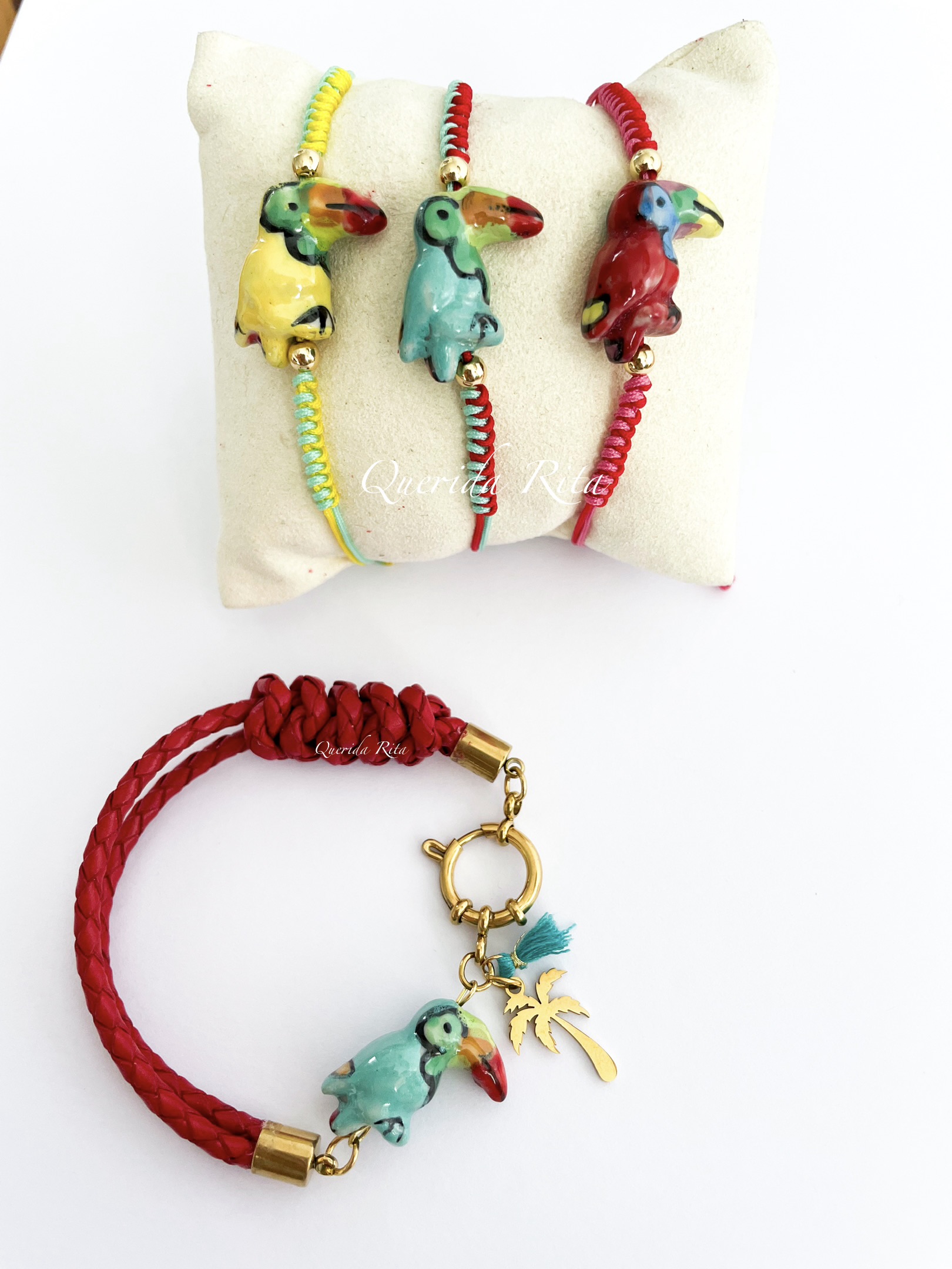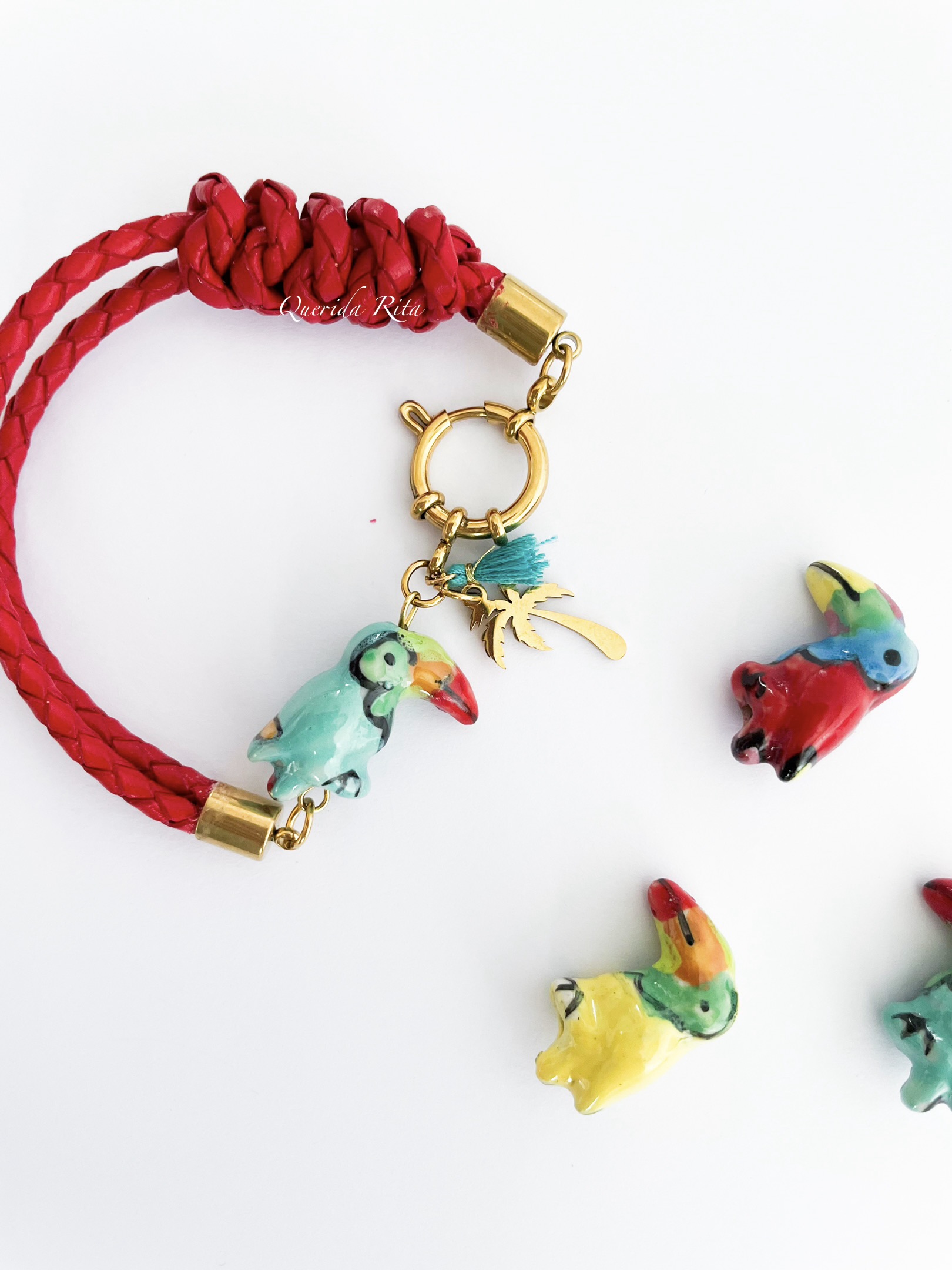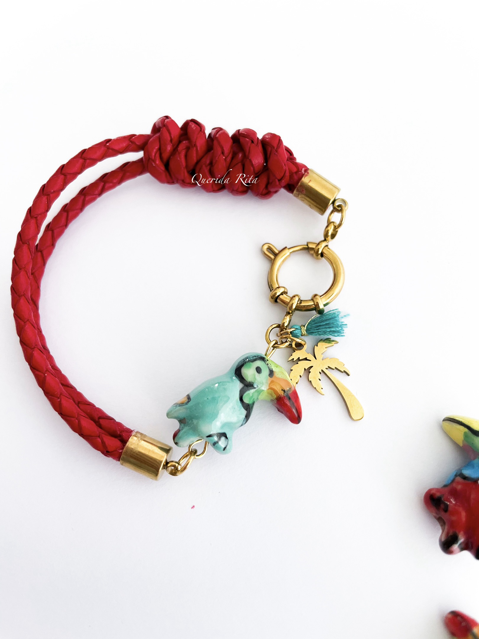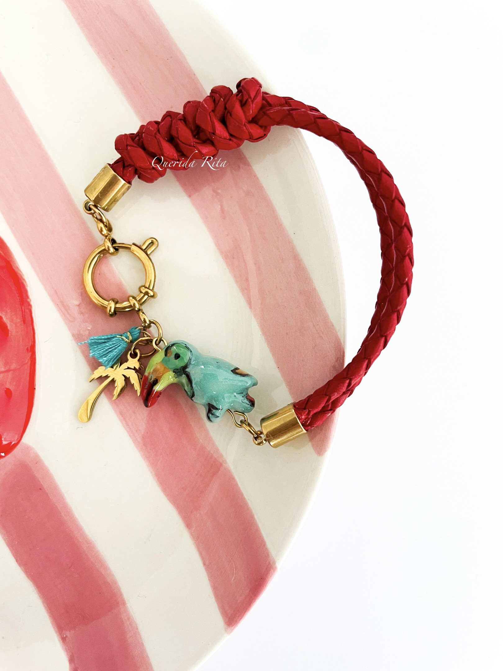 Pulsera de cordón de cuero trenzado en color rojo, elaborada a medida para un ajuste perfecto. Cuenta con cierre y charms de acero inoxidable y un delicado loro de cerámica que aporta un toque alegre y tropical.