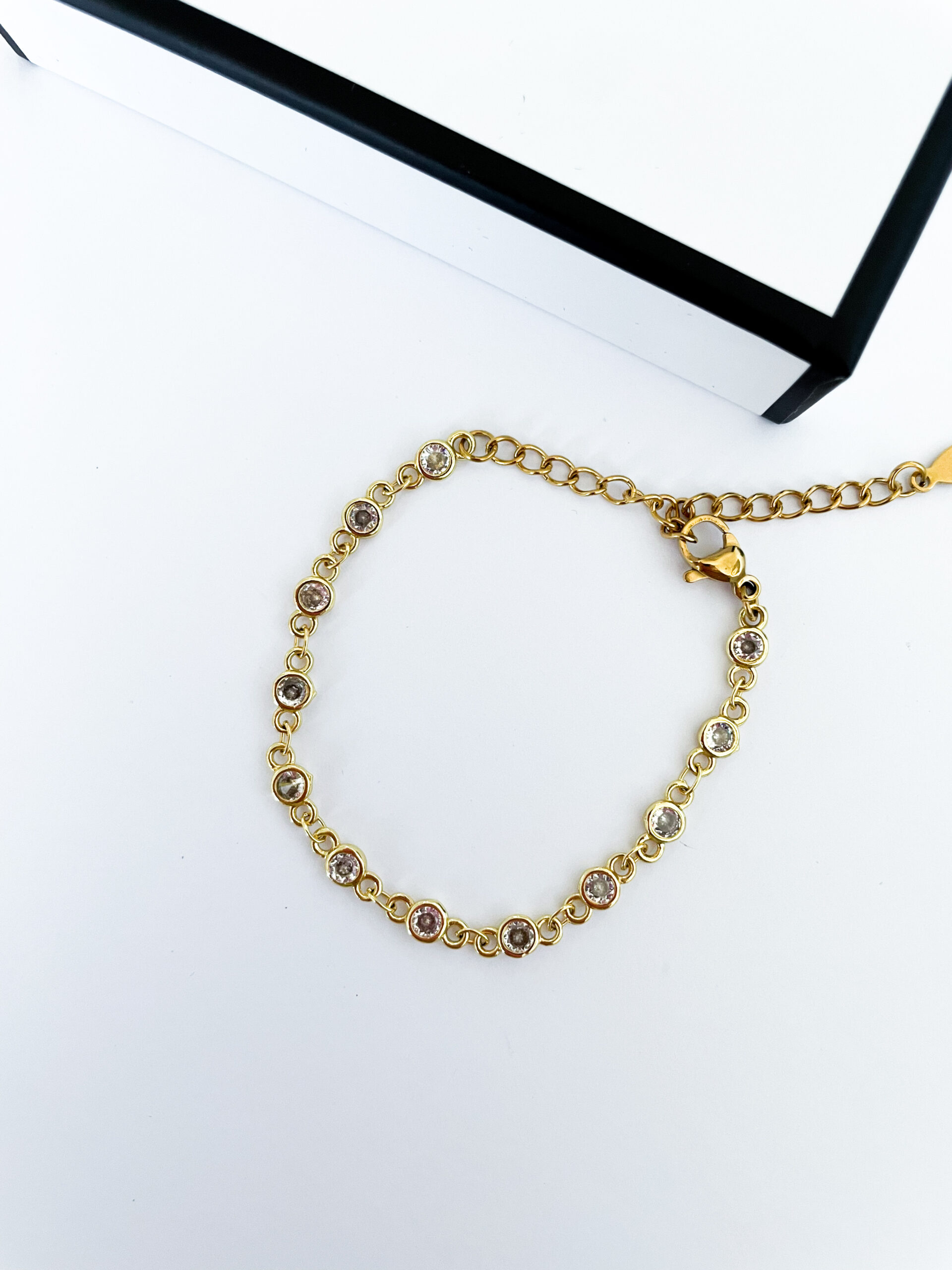 La elegancia convertida en un diseño atemporal. La pulsera Estelle está elaborada en acero inoxidable dorado con circonitas que capturan la luz en cada movimiento, aportando brillo y sofisticación.