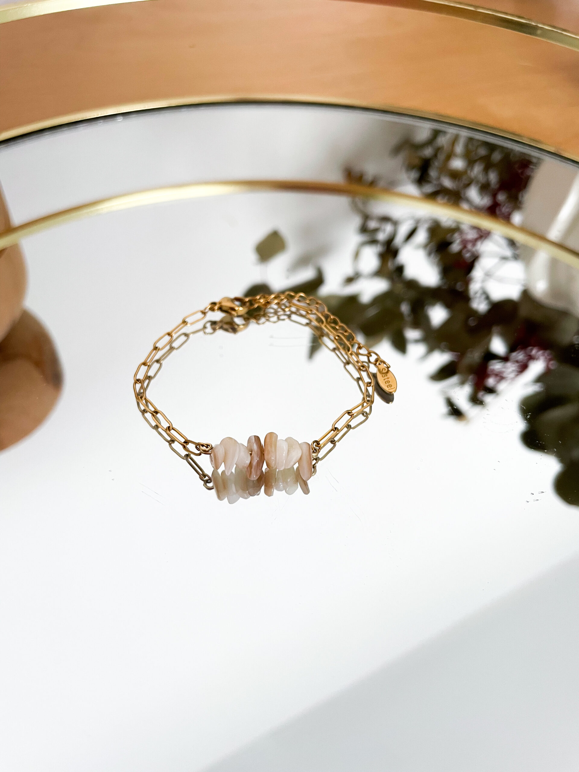 La pulsera Ivoria combina la elegancia atemporal del acero dorado con la sutileza de las piedras de nácar natural. Su diseño aporta un efecto sofisticado y versátil.