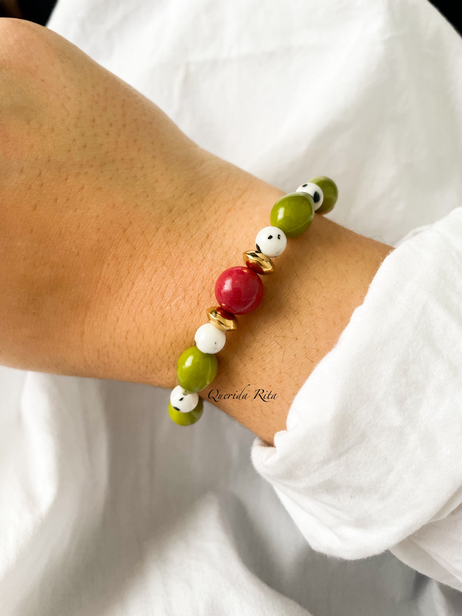 Delicada, natural y llena de calma. El jaspe y el cristal verde oliva se combinan con detalles en acero inoxidable creando una pieza ligera y elegante, pensada para acompañarte cada día.