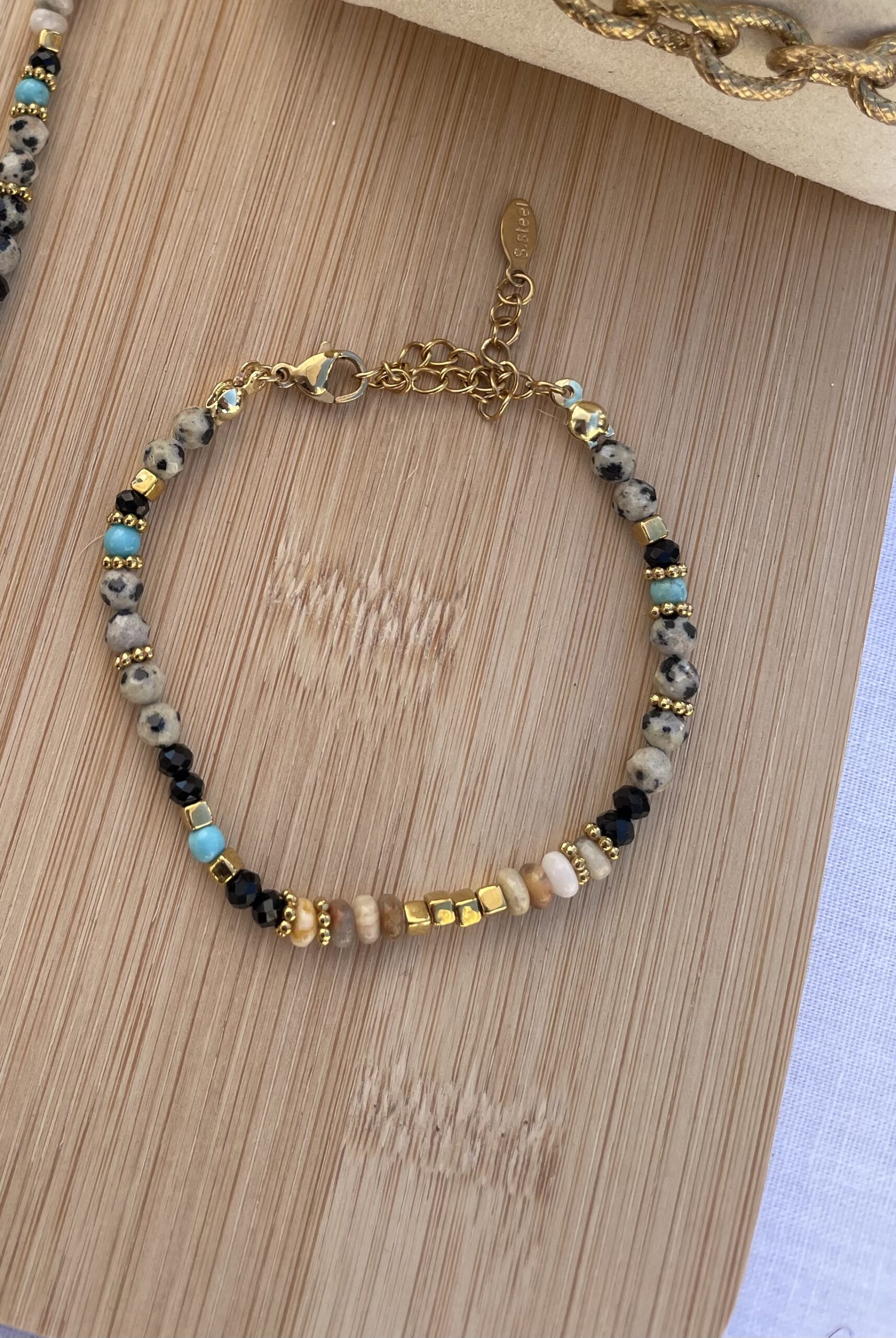 Está elaborada con una cuidada combinación de piedras naturales y acero inoxidable, creando una pieza con carácter, equilibrio y un estilo salvaje pero sofisticado.